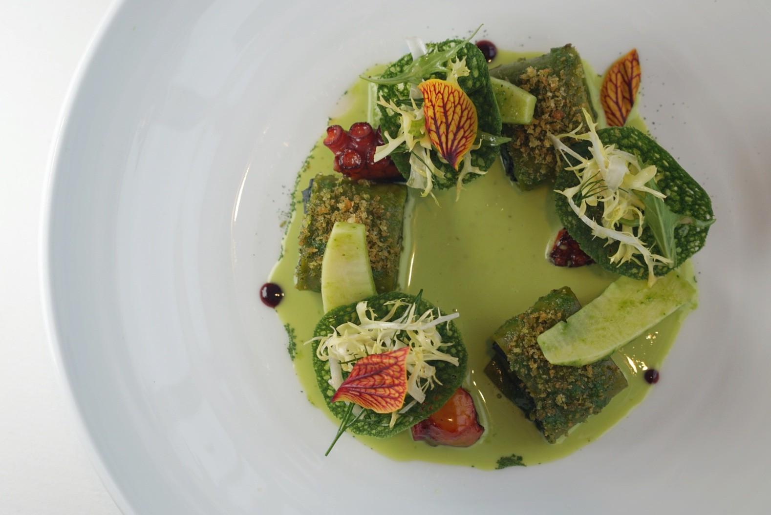 Expertly seared knobs of octopus are interlaced with green parsley chips, garnished with frisée and edible flowers. An herbaceous snail sauce dotted with licorice bouillon brightens the plate in both hue and heft.