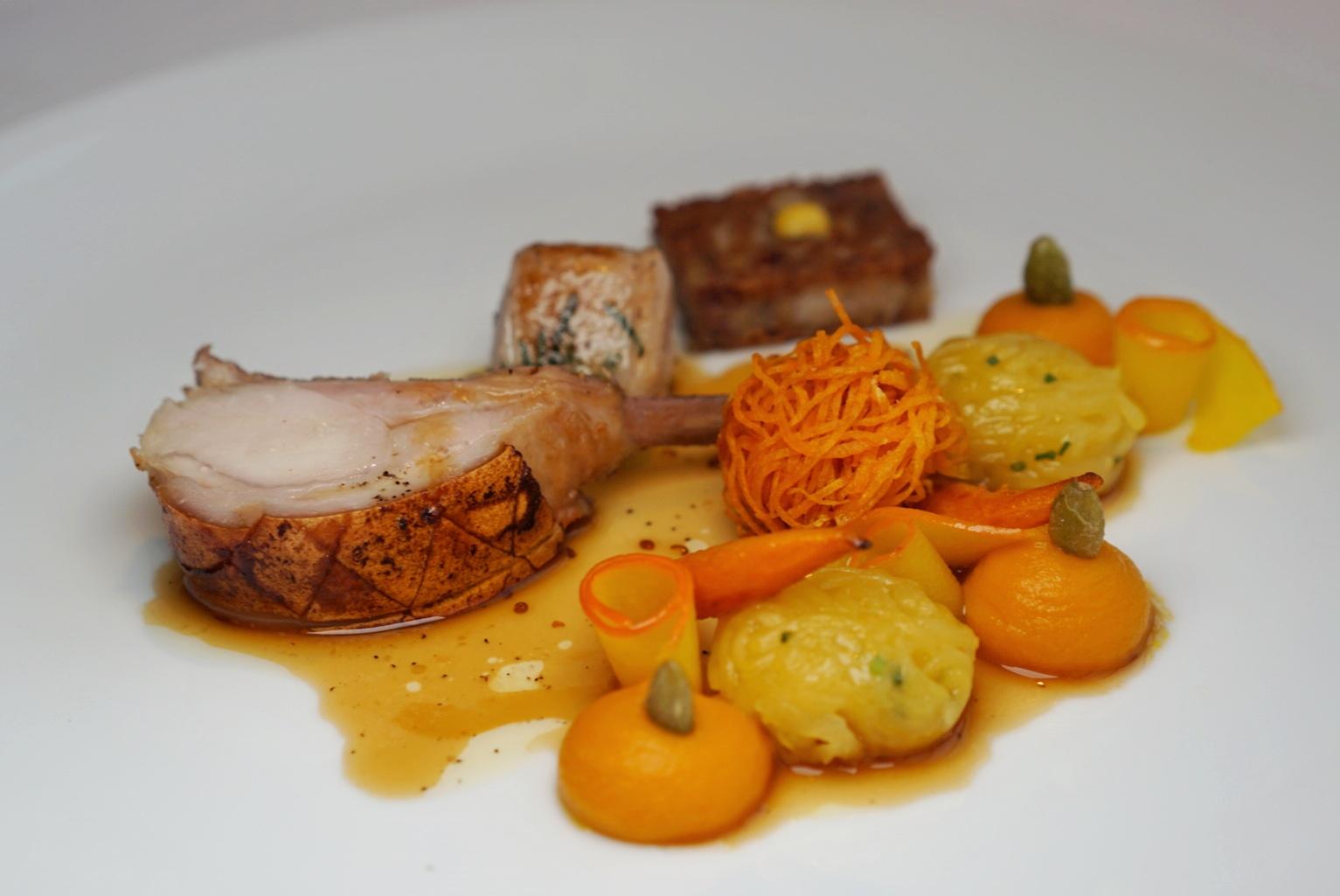 Flanked by a textural palette of pumpkin, squash and sweet potato – rolled in whirls, fried to a crunch, mashed and piped in creamy dollops and squiggled into spaghetti – the plate is dribbled with a mustard seed and coffee jus reduction.