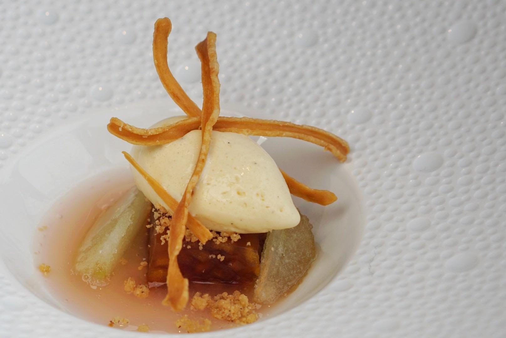 A crispy tuille of chestnut encircles soft biscuit, filled with kumquat marmalade, chestnut cream and chestnut purée in the form of a Chestnut Mont Blanc. Topped with chestnut ice cream, chestnut jellies and a bubbly chestnut foam, this product-focused dish zeroes in on this nutty winter favorite.