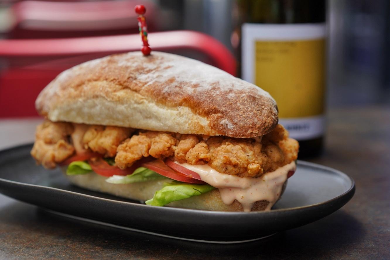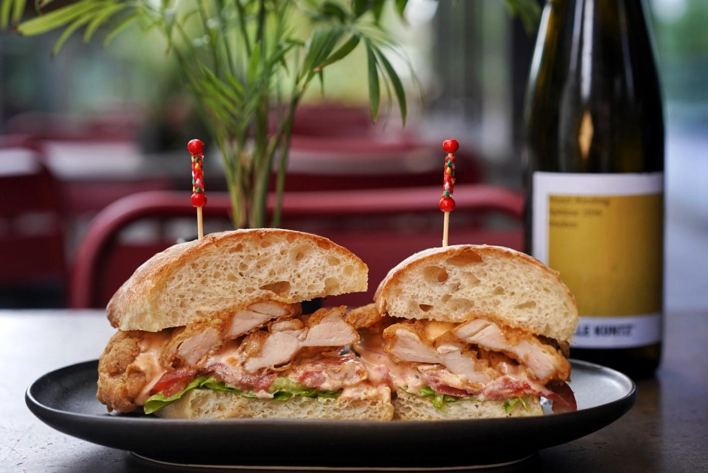 Featuring breaded chicken thigh (seasoned with cayenne, thyme and oregano), tomato, lettuce and a fiery secret sauce on plush, homemade ciabatta, the spicy heat is tempered by the suggested wine pairing, a dry Sybille Kuntz Riesling Spätlese (RMB115).