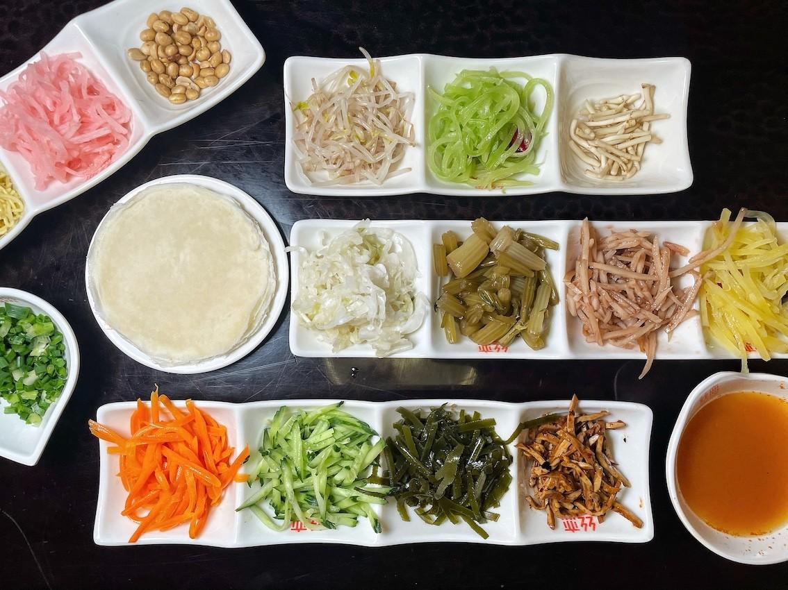 Everything from shredded vegetables, sprouts and pickled garlic to firm, marinated tofu, toasted peanuts and zhe'ergen (折耳根) – a strong-flavored root commonly used in Guizhou cooking – finds its way into these wraps, before being dunked into a tangy tomato broth.