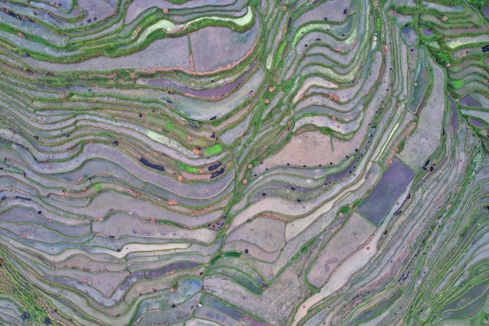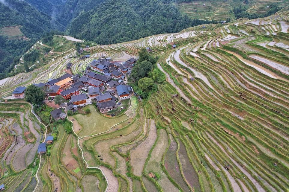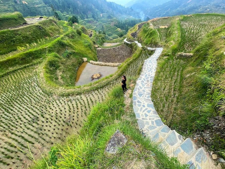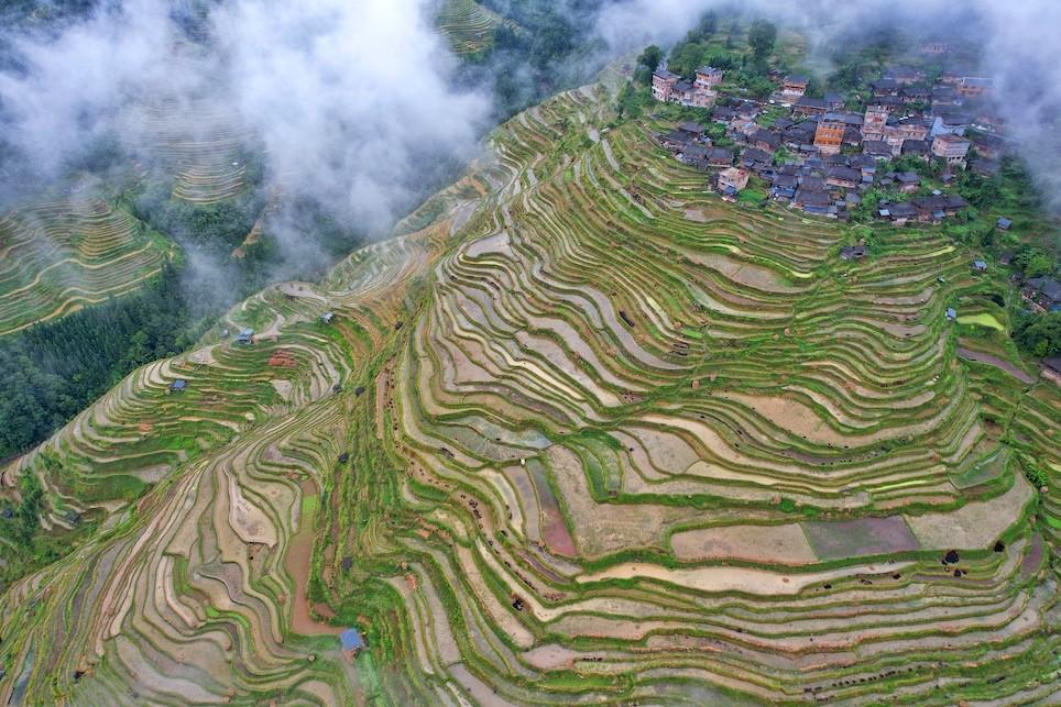 Situated in a secluded part of Congjiang county, the terrace spans ten kilometers, changing from vibrant green in summer to shimmering gold in fall to snow-flecked white in winter to reflective mirrors of watery blue in spring.