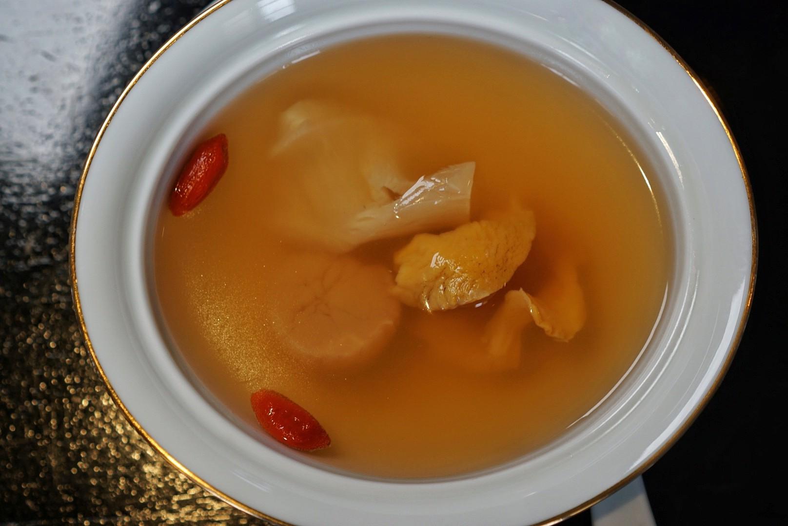 The herbal Boiled Sea Treasure Broth (RMB188) borders on medicinal – but in a warming Cantonese soup kind of way – with fish maw, dried scallop, sea whelk and goji berries.