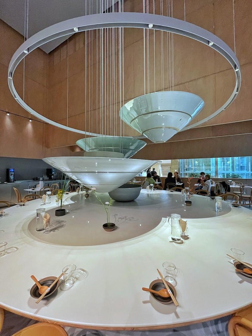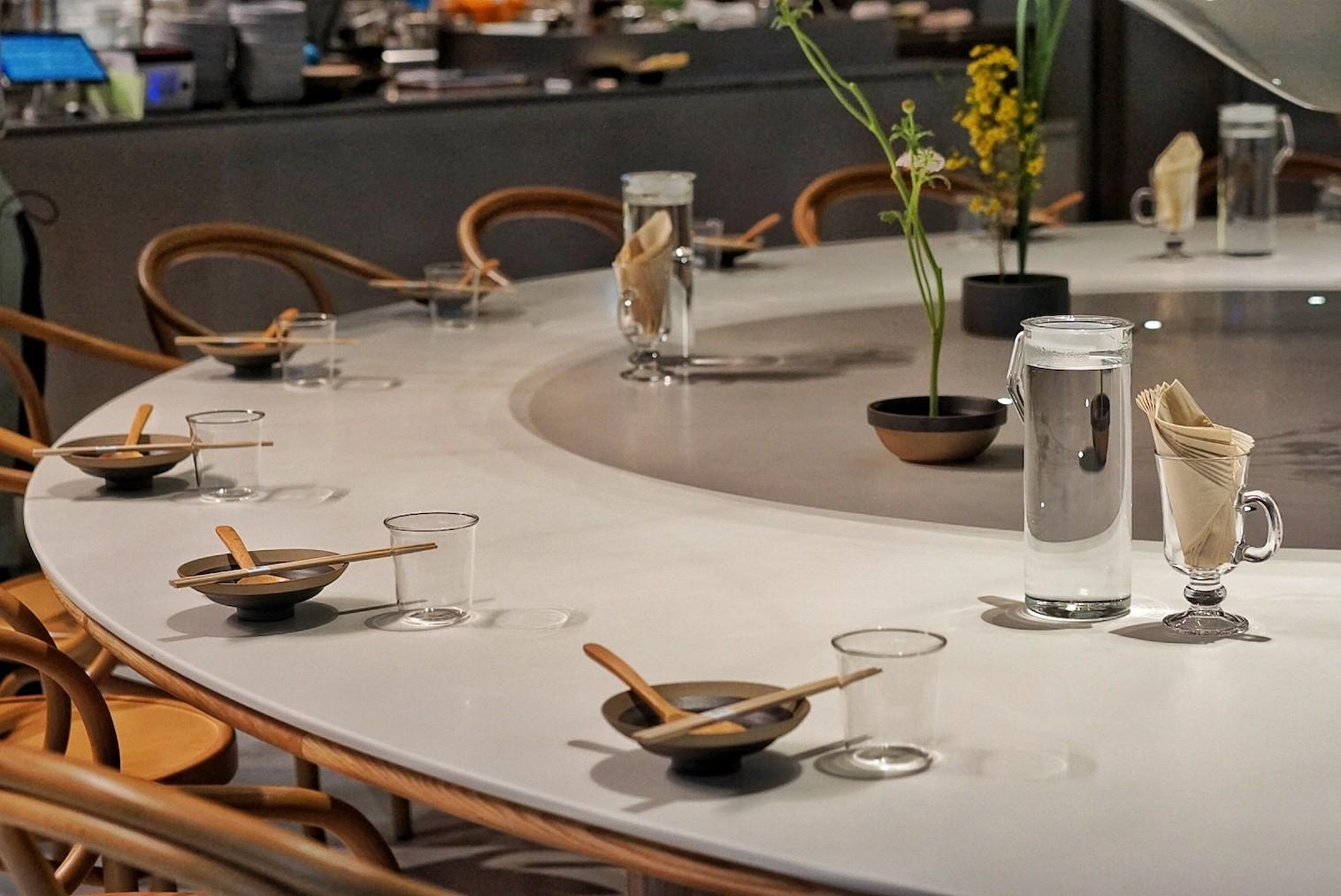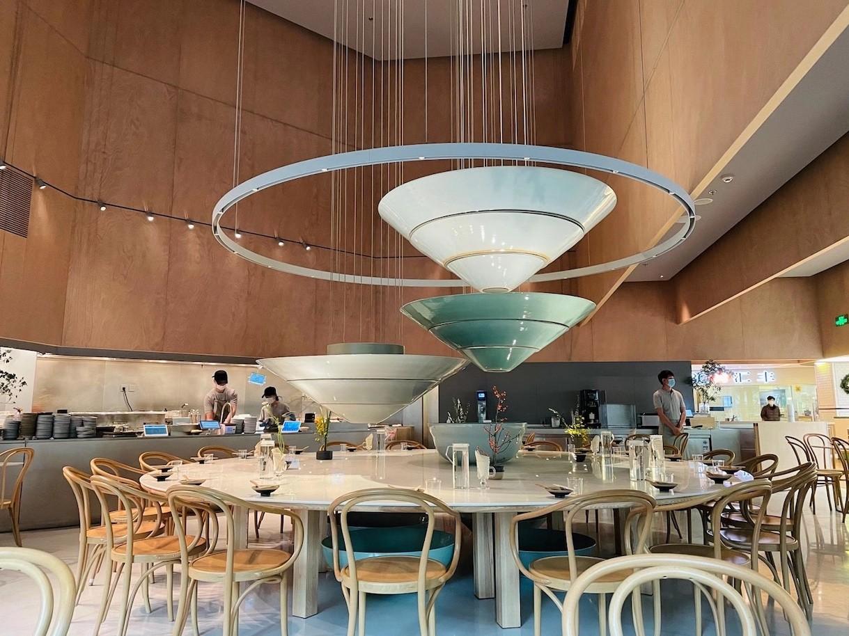 The hollowed out half spheres – made from Jingdezhen ceramic – that hang at different levels from the ceiling may seem like a random choice for a predominantly lunch-focused spot in the Jing’an Kerry Center, but when you picture them instead as bowls with the supporting metallic cords as springy noodles, the modern art interpretation of what this restaurant is all about comes through.