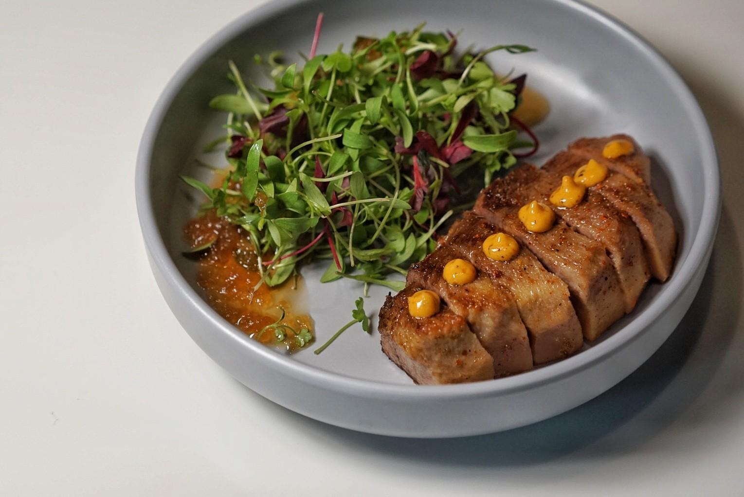 Each piece of delicately tender Ox Tongue (RMB60) is topped with a dollop of perilla aioli and served alongside an aromatic micro green salad, dressed with a grapefruit pulp and apple cider vinaigrette.