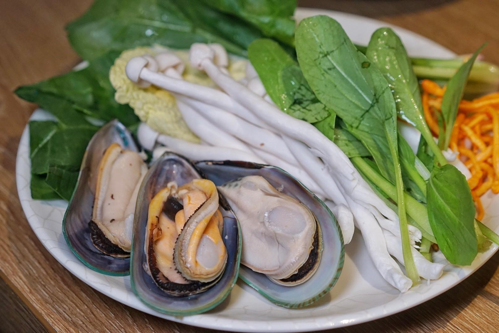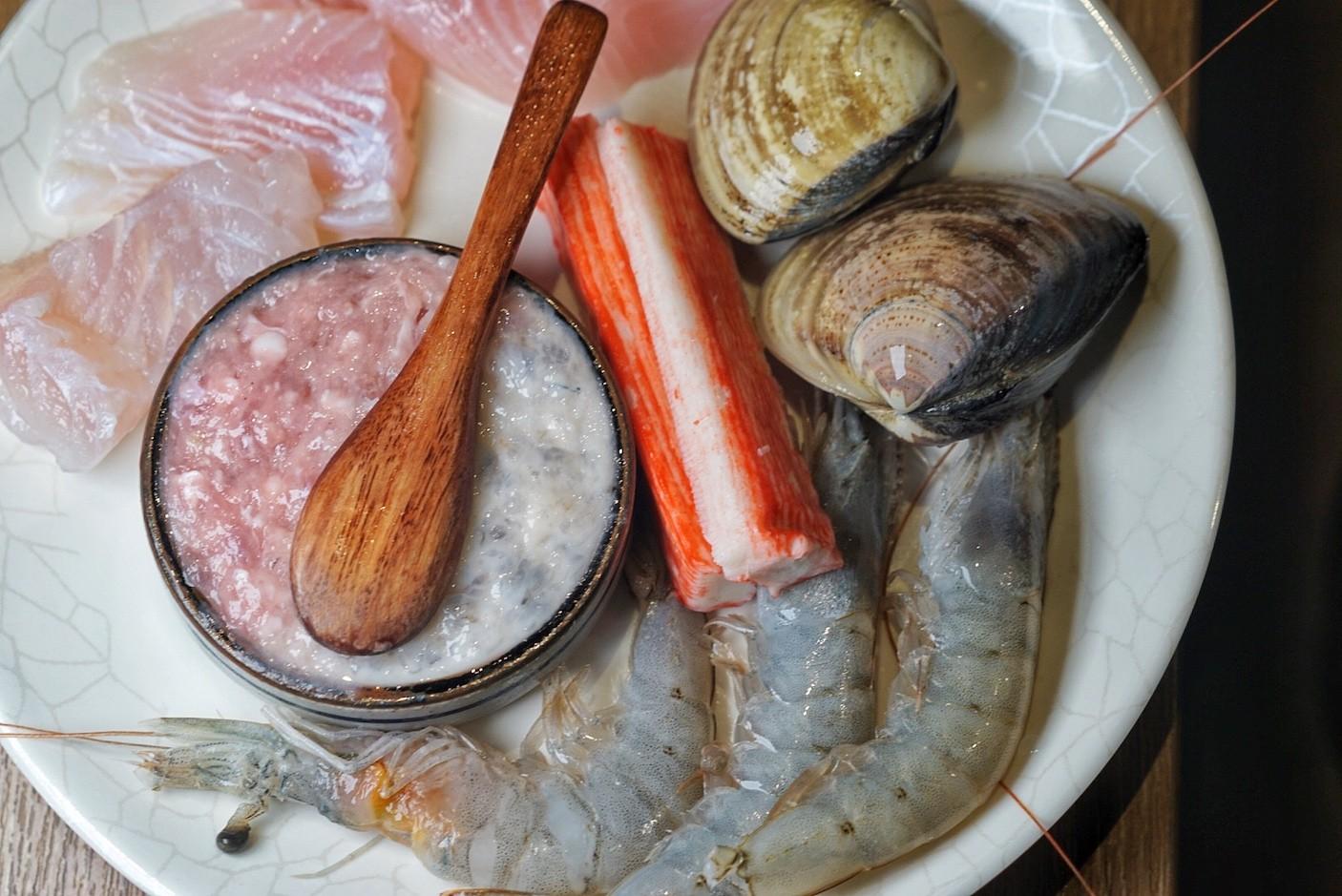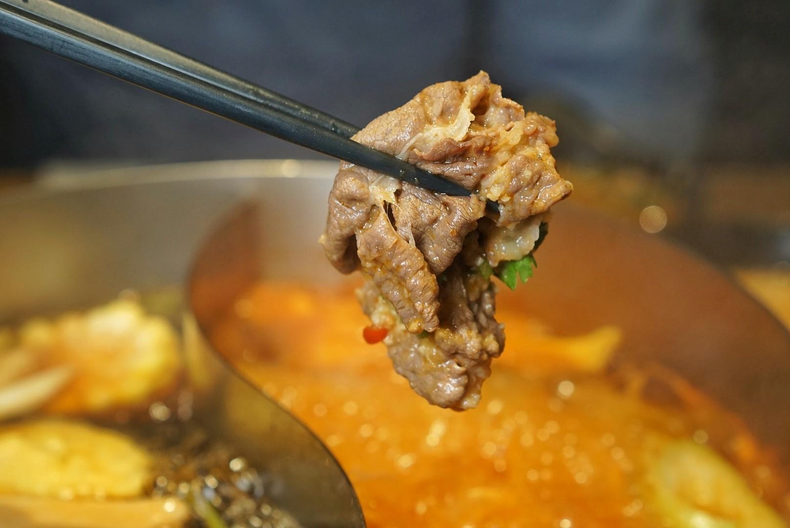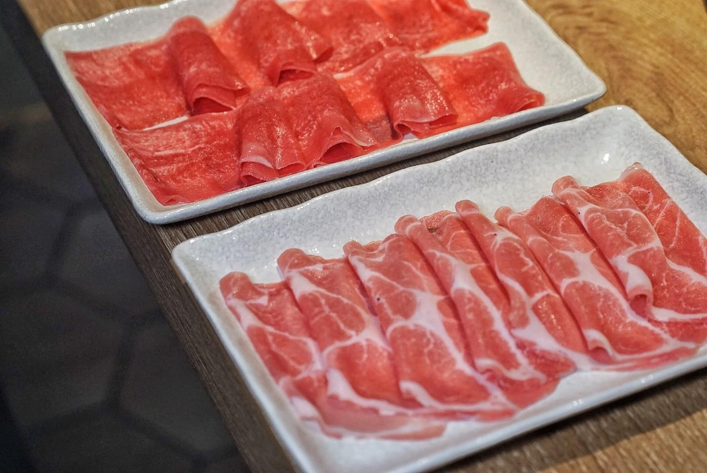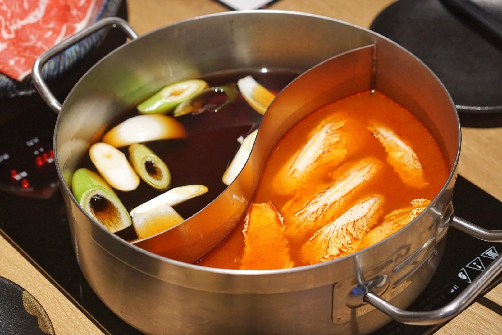 Diners can select two soup bases from the seven total choices (shabu-shabu, sukiyaki, beef bone, tom yum goong, pork stomach & chicken, kimchi or tomato), and the price per person is determined by the meat set selected.