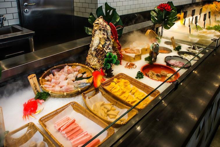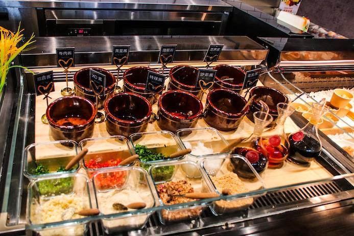 To accompany your meat feast, the buffet spans seafood – prawns, mussels, freshly sliced fish, shrimp and fish balls, crab sticks, whole crabs, clams and octopus; vegetables – assorted greens and cabbage, mushrooms of all sizes, corn, potatoes, broccoli, seaweed, bamboo and daikon; other hotpot favorites – firm tofu, shrimp dumplings, tofu skin, noodles, luncheon meat and more; and a full on sauce bar with dozens of sauce bases and add-ins to customize the ideal hotpot sauce for you.