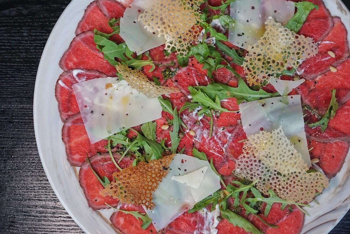 Crispy, lace-like parmesan cheese tuiles alternate with thinly sliced shaved parmesan atop the Wagyu Beef Carpaccio (RMB98). A drizzle of truffle oil, crisp arugula and homemade fresh pesto add earthy herbaceousness, while roasted pine nuts bring a necessary textural crunch.