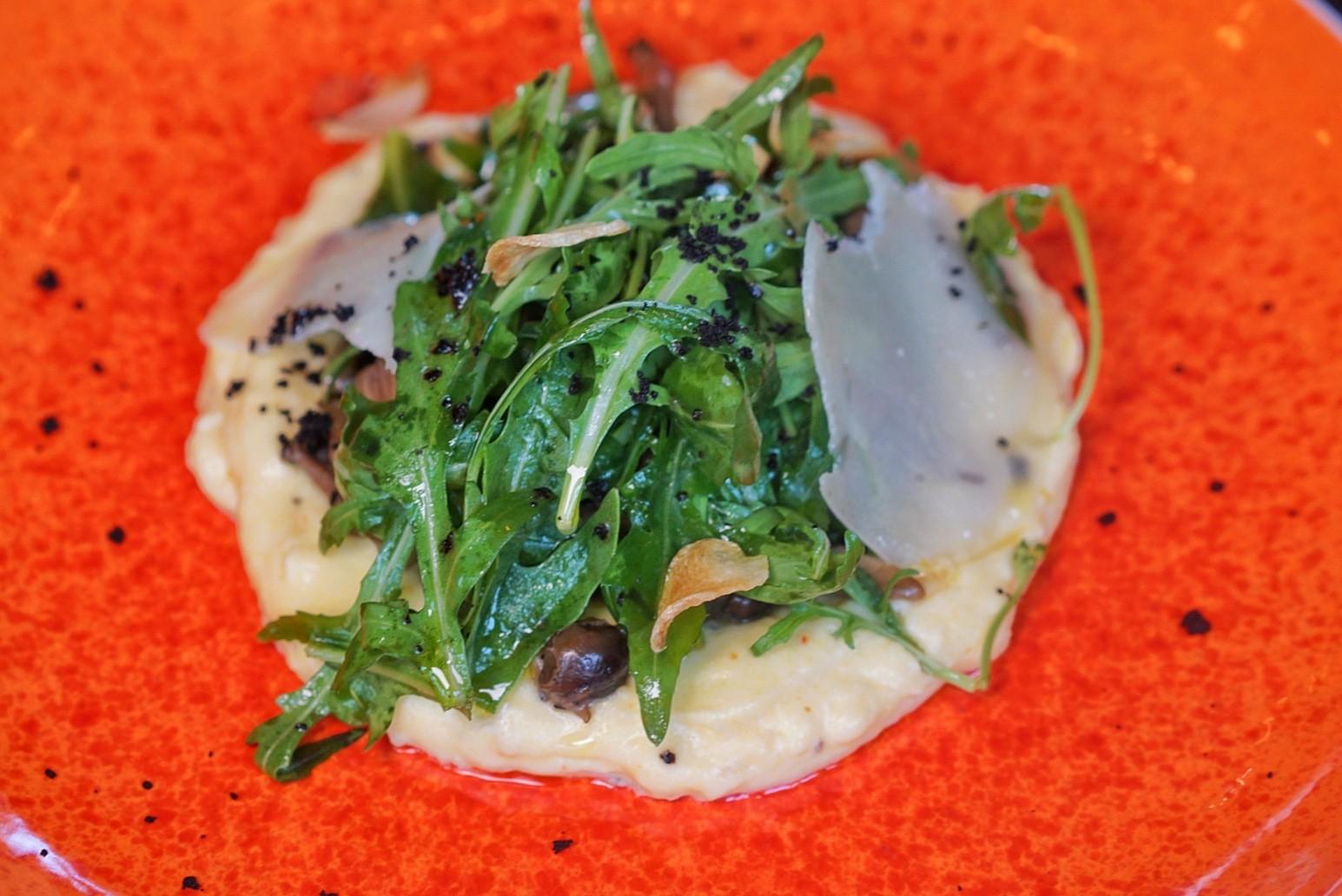 Creamy rosemary polenta pairs with porcini mushroom ragout in the Mushrooms & Polenta (RMB68). A garnish of arugula, parmesan and truffle oil brighten the plate.