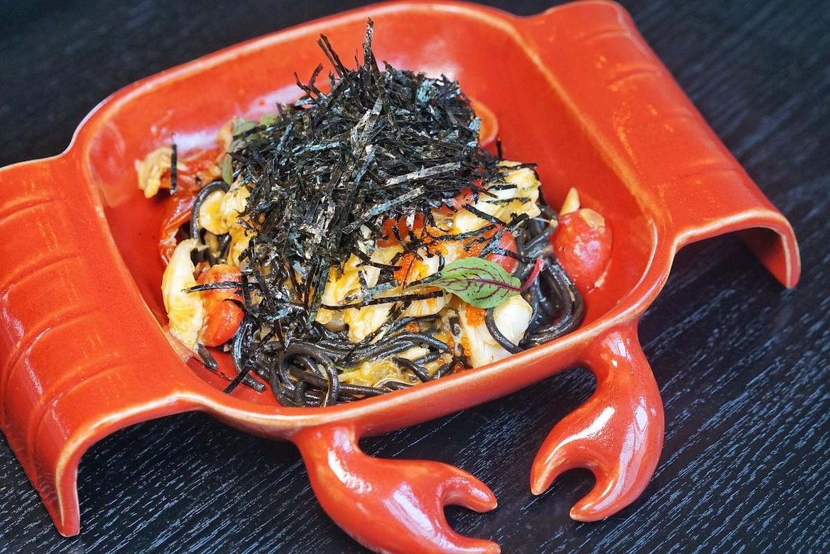 Roasted cherry tomatoes peek out between strands of black pasta, seasoned with spicy prawn oil, shiso leaves nori and – most importantly – big meaty chunks of tender crab meat in the Red Crab Pasta (RMB128).