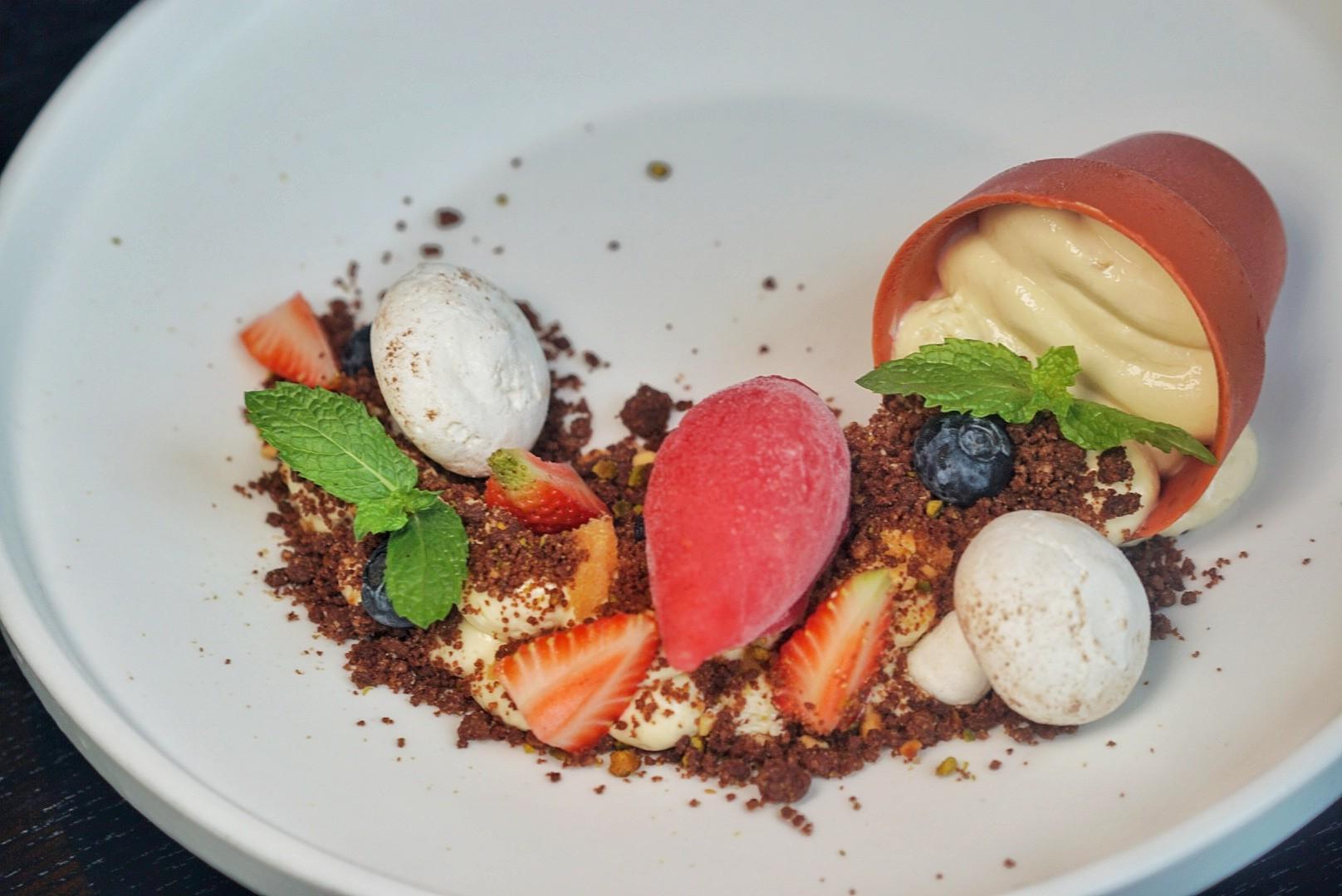 Mushroom-shaped meringue, fresh fruit, mint and berry sorbet garnish the splattered garden. In Chef Will Colmenares’ true whimsical fashion, diners can break open the pot with a golden hammer served on the side, grab a chocolate shard and use it to dip in the tiramisu shrubbery.