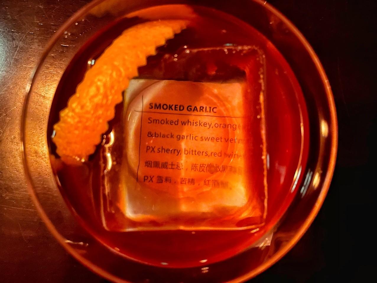 For those who like their libations booze-forward, the Smoked Garlic (RMB95) is where it’s at. Smoked whiskey is balanced by PX sherry, vermouth, orange peel and black garlic, topped with a hit of red wine.