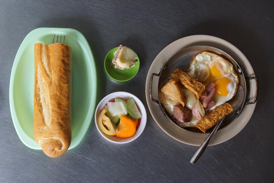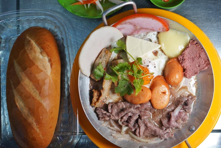 Bánh mì Chảo Anh Mập: For a Vietnamese-style breakfast (available all day and night), this shop serves "bánh mì chảo" (sizzling pan bread), served with black pepper sauce. Like a deconstructed banh mi of sorts, the meal of beef, sausage, eggs, cheese, and other toppings arrives on a hot sizzling pan, accompanied by a fresh Vietnamese baguette and a side salad.