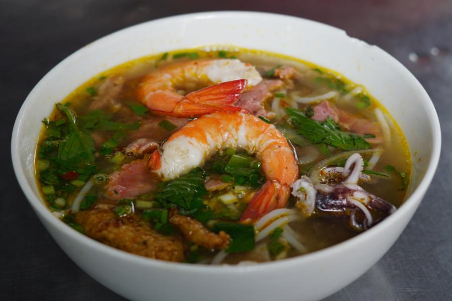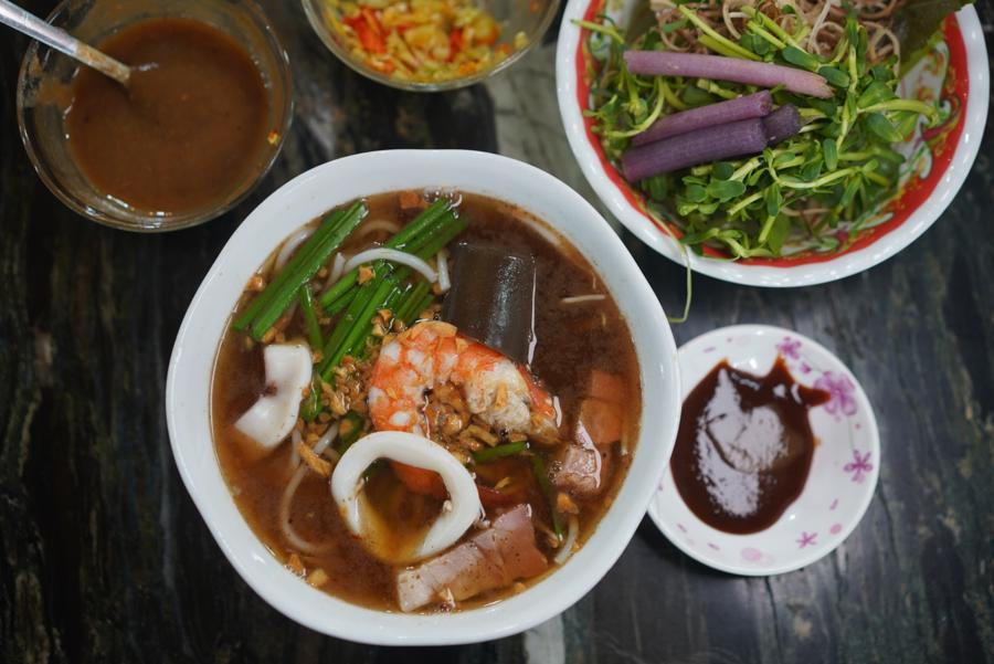 Bún Mắm Phan Bội Châu: This legendary shop serves top notch bun mam in a rustic setting, popular amongst tourists and food bloggers. The sweeter, fish sauce-laden broth creates a murky, rich brown color, spiced and seasoned with herbs. Generous portions of eggplant, shrimp and pork belly round out the bowl, along with hot peppers and fried garlic.