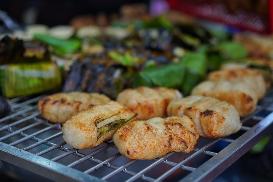 Chuối Nếp Nướng: This renowned street food stall grills up a humble yet addictive dessert: ripe finger bananas are wrapped in a layer of glutinous rice, further wrapped in a banana leaf, and then grilled slowly over charcoal until the sticky rice is golden and crispy. The grilled parcel is cut into bite-sized pieces and generously covered in a warm, salted coconut cream, and a sprinkling of toasted sesame seeds, and crushed peanuts for just VND14,000.