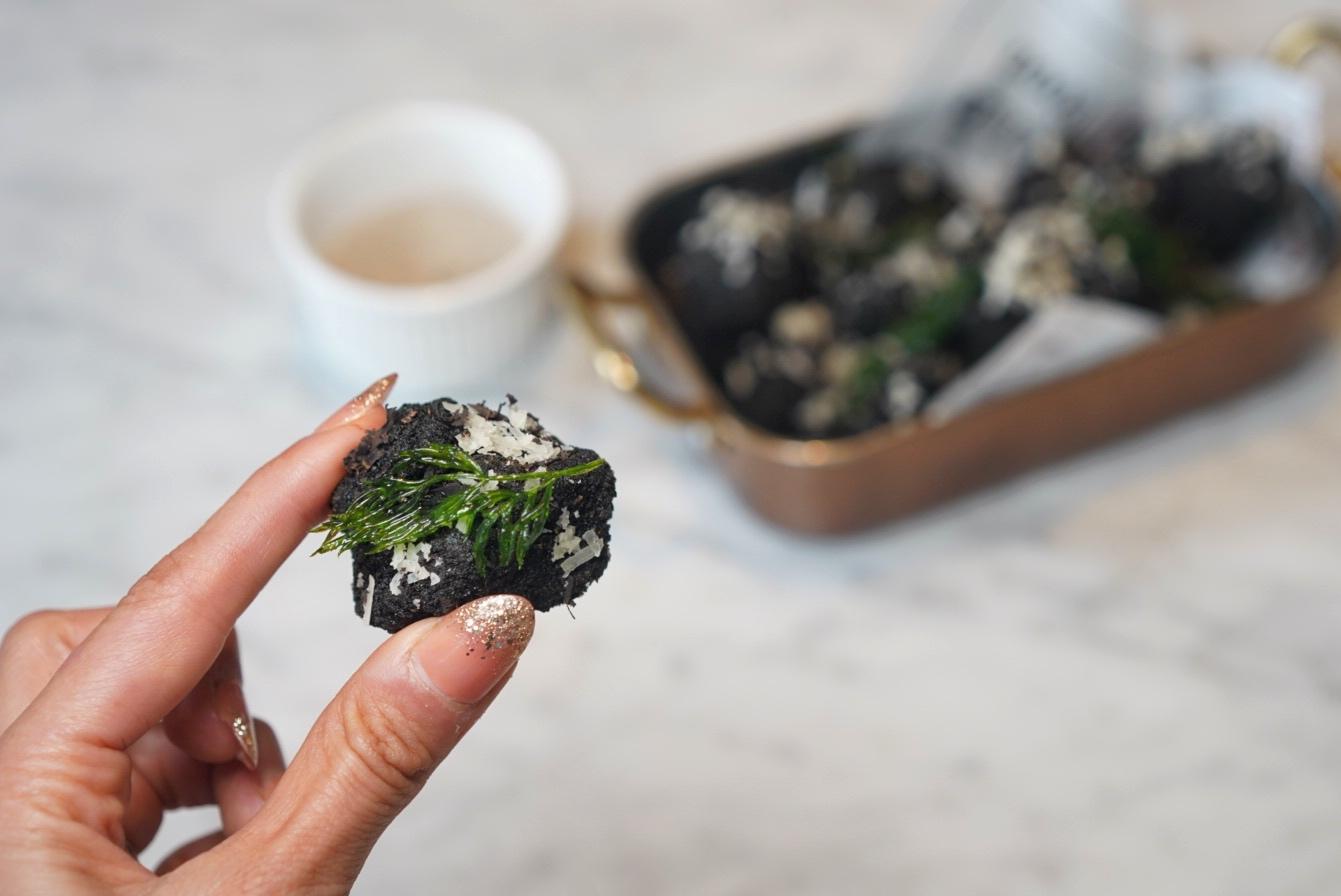 Moving into meat and seafood heavy antipasti, activated charcoal is what lends the breaded truffle chicken bites – Pollo e Tartufo (RMB78) – their onyx hue, fried to a crisp and best enjoyed dipped in a smarmy truffle mayonnaise.