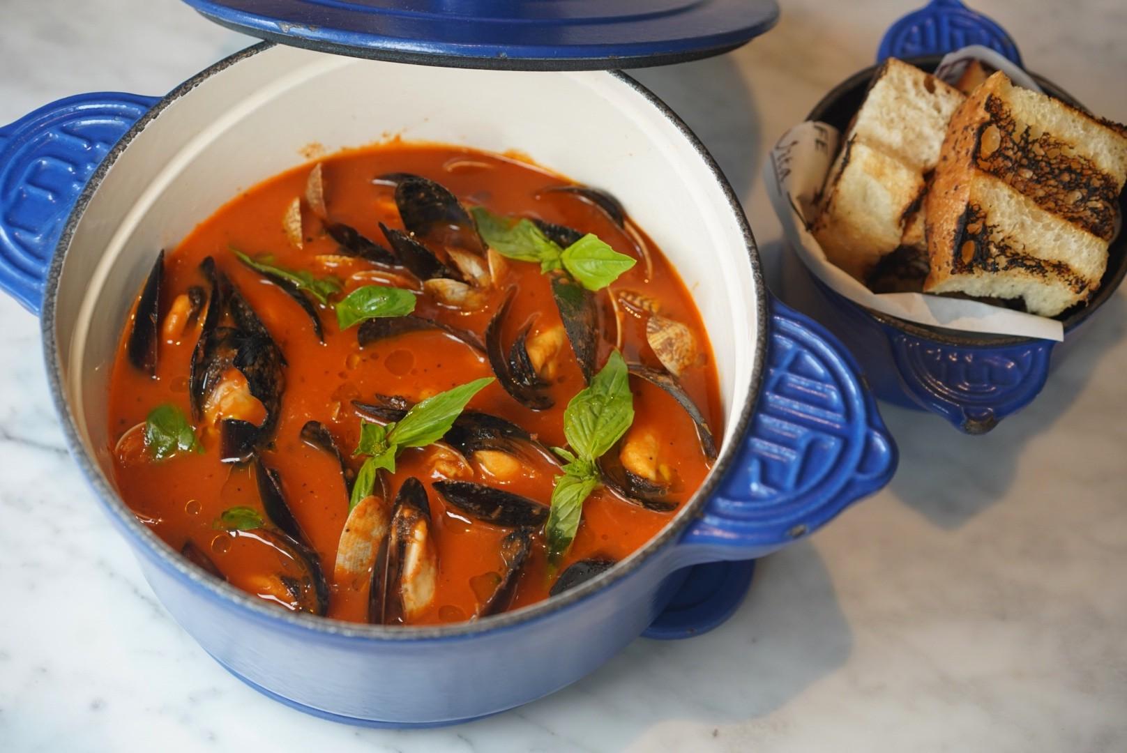 … and the seafood forward Pescatore (RMB108), adorned with shrimp and black mussels atop DOP tomato sauce and mozzarella, studded with stretchy blobs of buffalo mozzarella, confit garlic slivers and a dribble of chili oil.