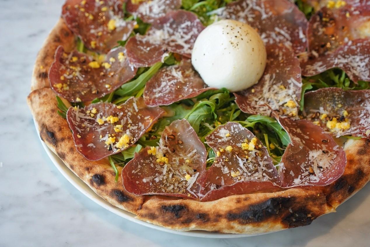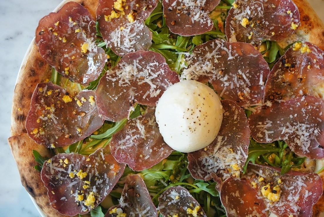 A sheathing of bresaola, rocket and grana padano are layered above melted mozzarella, sprinkled with an egg yolk crumble and dried mushroom dust.