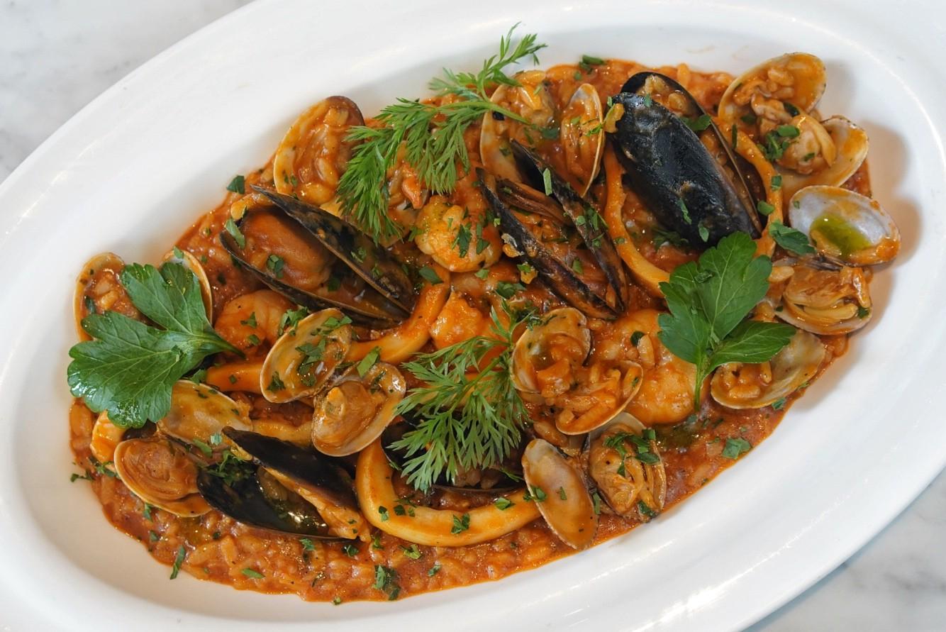 Clams, mussels, squid, rice, and fresh herbs are cooked in a base stock made from white wine and assorted seafood, finished with a homemade lobster bisque as the Risotto ai Frutti di Mare (RMB108), a tidal wave of oceanic umami with a pleasantly chewy rice backbone.