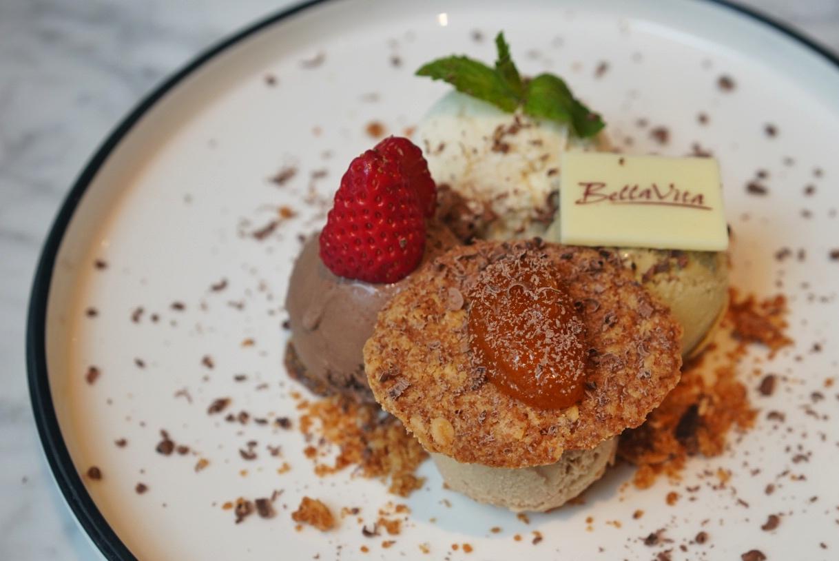 Homemade gelato from Bella Vita’s sister venue Buonissimio takes center stage in the Bella Vita Gelato Platter (RMB88), featuring a quartet of flavors that represent tastes of Italy: Sicilian pistachio; IGT Piedmont hazelnut (topped with a butter cereal cookie to mimic an ice cream cone); Madagascar vanilla; and 74% chocolate, plus a dollop of homemade orange jam.