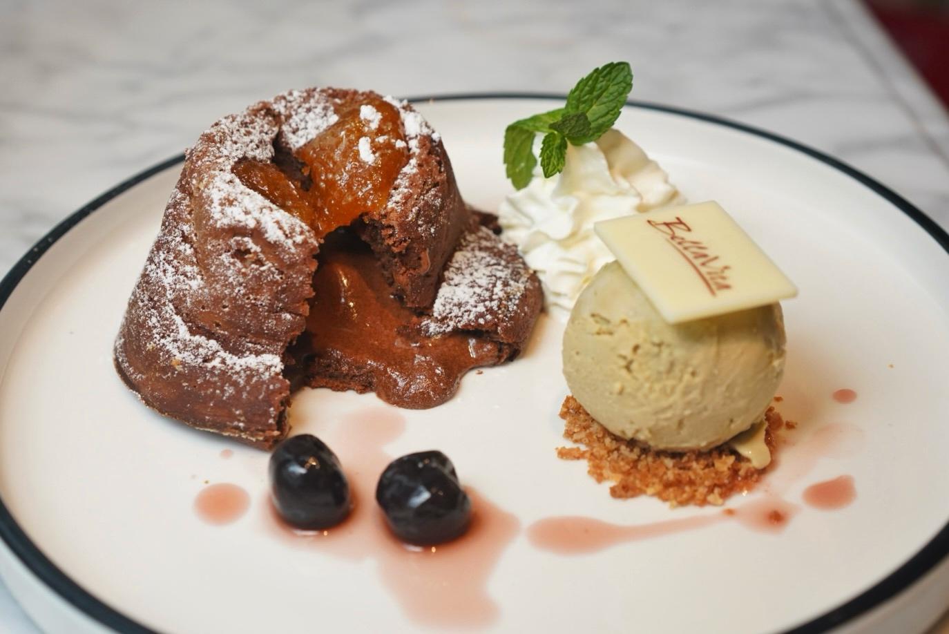 A molten chocolate bomb, the Tortino al Cioccolato (RMB48) showcases an avalanche of cocoa flowing from a 50% chocolate lava cake.