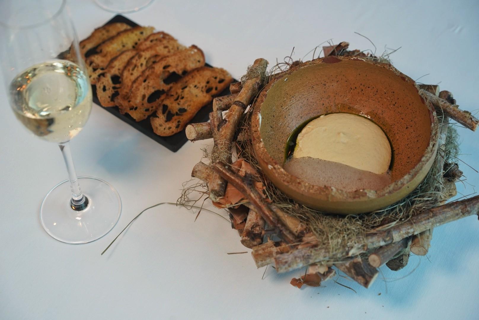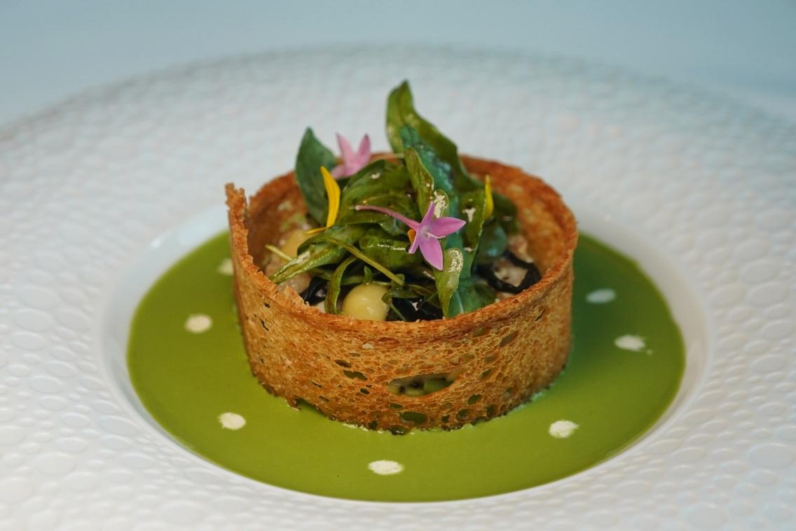 Amuse Bouche: Hummus Mousse – Celery oil, champagne foam, bread crisps