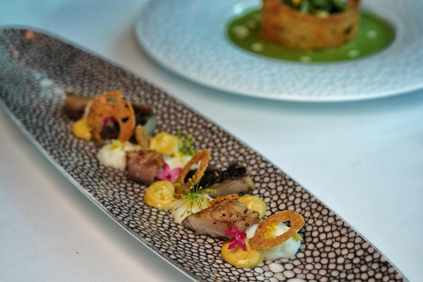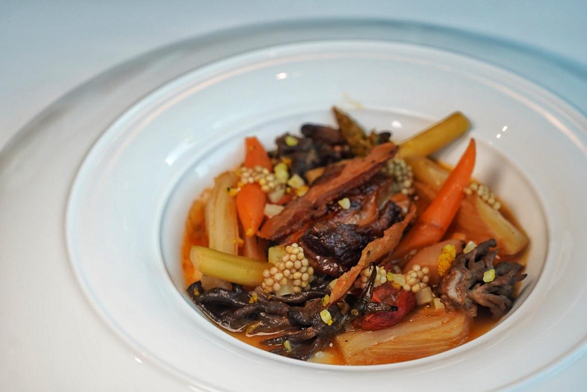 Aromatic autumnal vegetables – mushrooms, carrots, baby tomatoes, celery, and cabbage – are combined with fatty morsels of guanciale and thick slabs of pork belly, all marinated and slow-roasted for 48 hours as the Confit & Grilled Pork Belly.