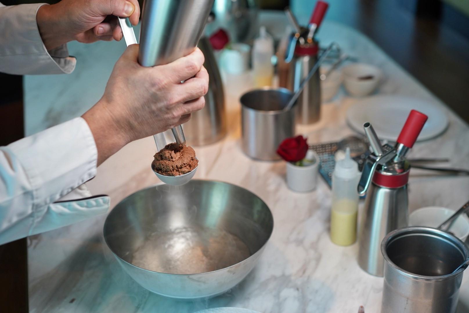 The aforementioned DIY Nitro Chocolate Surprise is presented with a “side of cooking class,” where diners are able to take a stab at playing with ice – rather than fire – freezing a piped chocolate mousse sphere and plating it with vanilla cream, rose petals, and a dusting of chocolate powder.