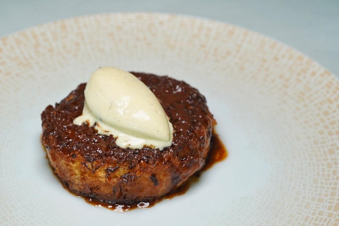 A finishing sprinkle of chocolate melts over the steaming pastry, while a quenelle of almond and southern French plum ice cream softens, seeping into the toast’s center.