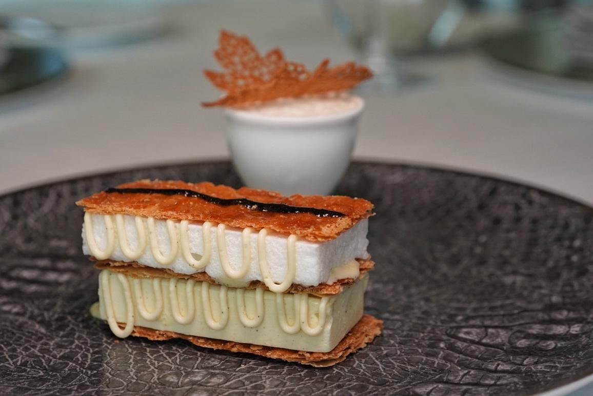 While diners indulge in their frozen chocolate treat, a second round of desserts begin to arrive, from a stacked French Millefeuille – caramelized puff pastry interspersed with a thick layer of Tahitian vanilla ice cream and a sweetened egg white meringue, dribbled with crème anglaise and piped pastry cream…