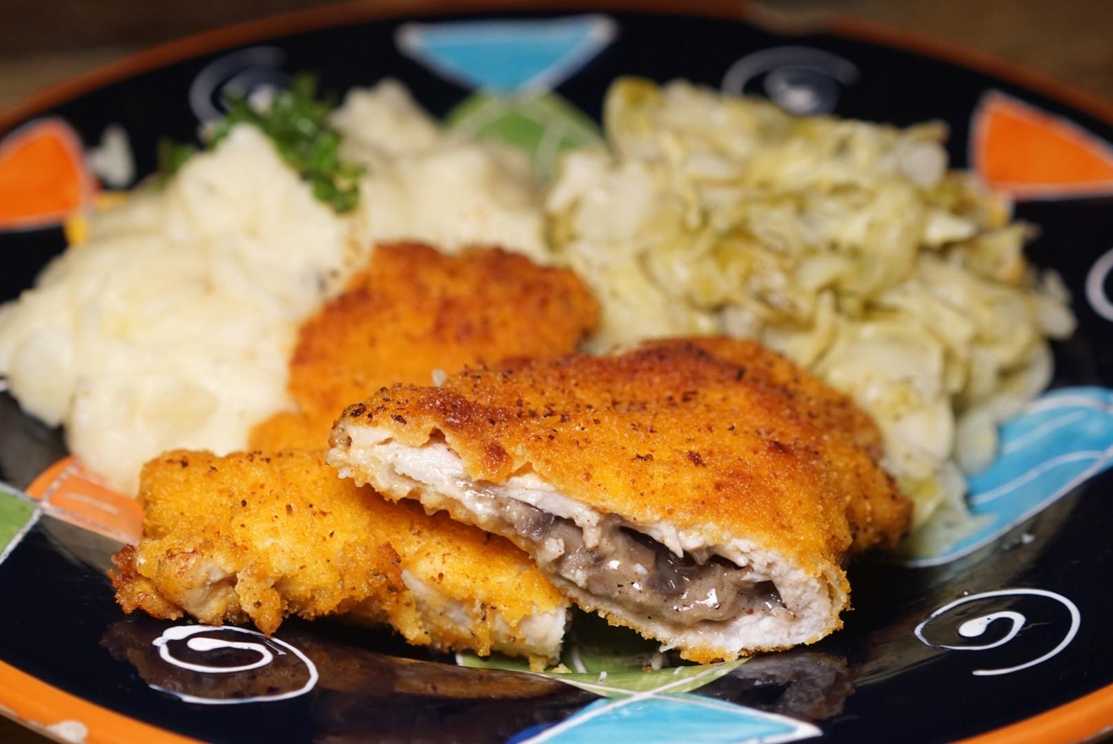Wrapped in mushrooms, cheese and onions, the Polish Stuffed Pork Chop (RMB88) is thickly battered and fried, served with potato purée and fried mustardy cabbage.