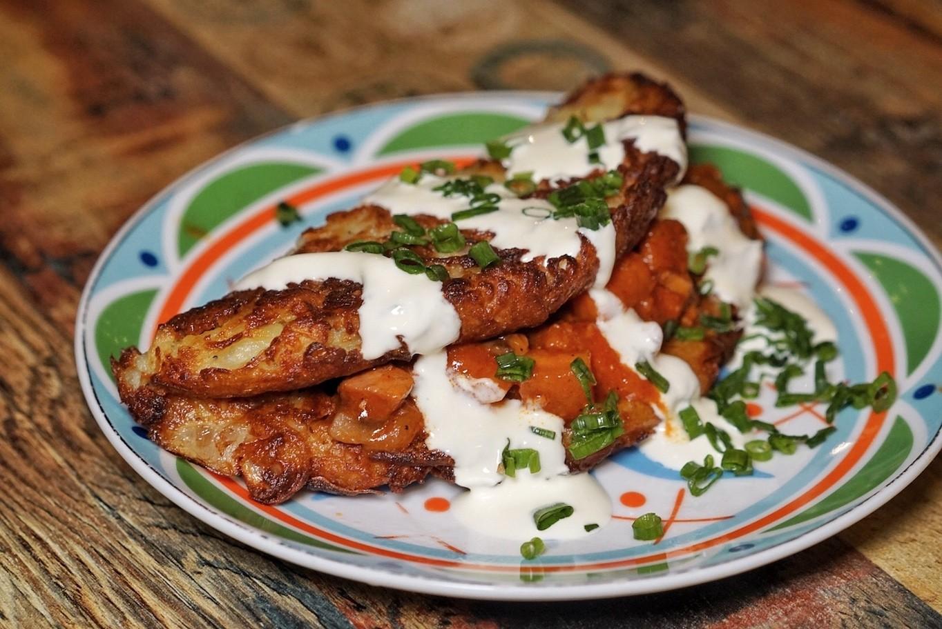 Like a bastardized taco, the thick layer of potato forms the outer shell, drizzled in cooling sour cream.