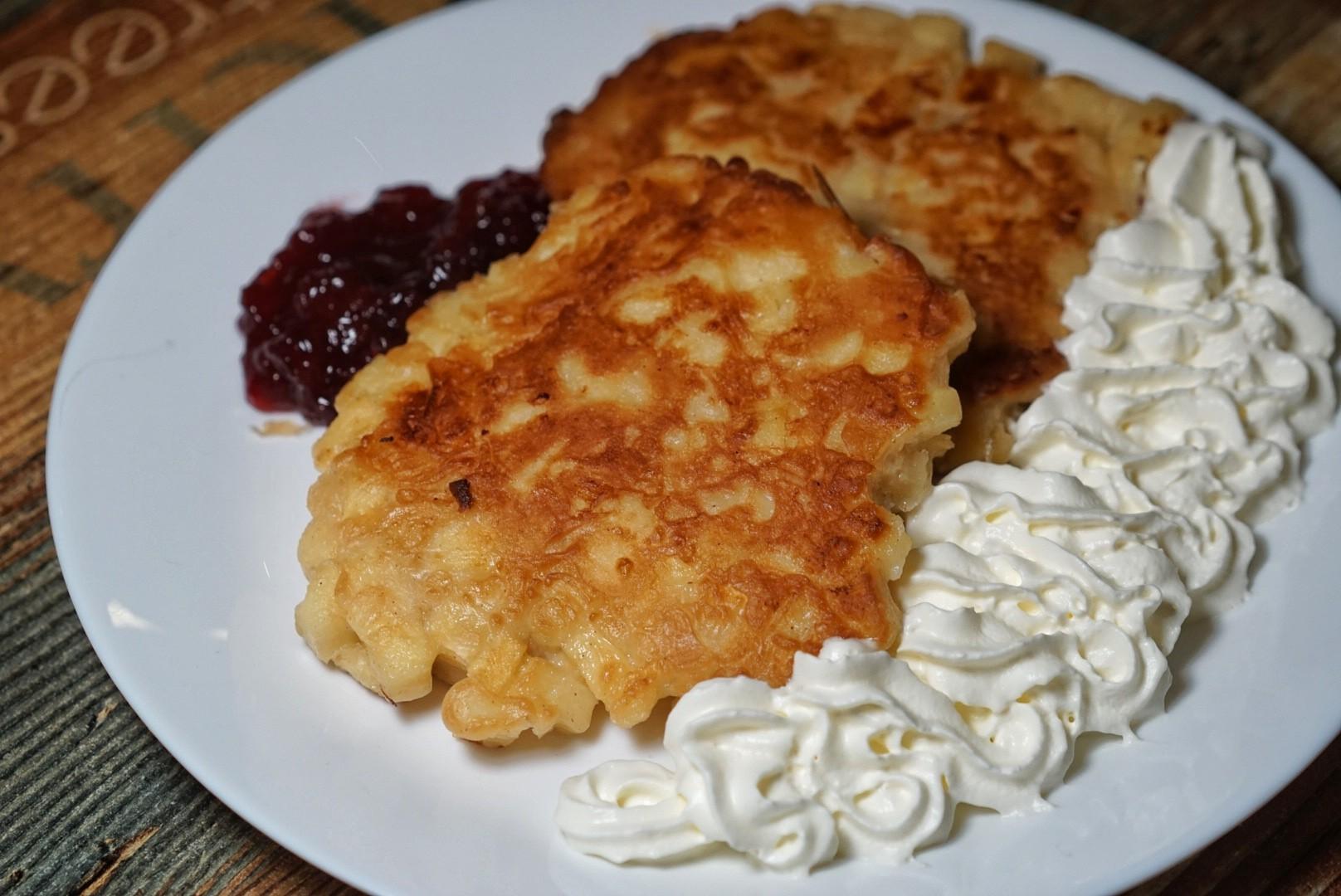 For dessert, a warm plate of fluffy Fried Apple Pancakes (RMB38) arrives flanked by whipped cream and tart berry jam.