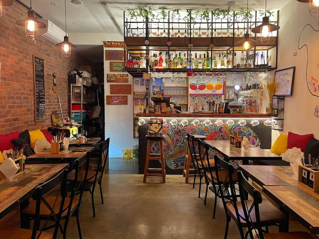 The spaces boasts a backpacker hostel atmosphere – twinkling string lights hung about, maps adorning the walls (dumping and pickle world maps to be more specific), travel books stacked on shelves, jars filled with all matter of this and that, board games, off-center framed photos of cooking class attendees and a free-roaming cat, making friends with all the patrons.