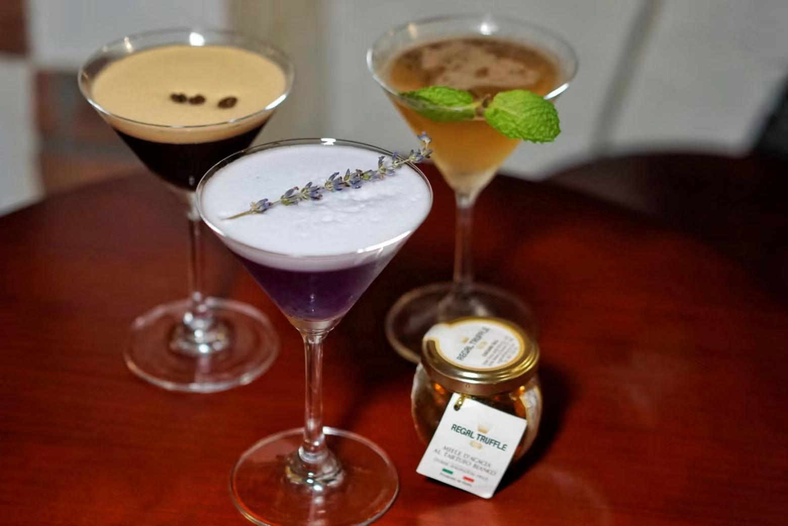 The Bison Truffletini (RMB98) highlights vanilla-scented bison grass-infused vodka, apple moonshine, apple juice and more of that truffle honey, while the Espresso Truffletini (RMB98) is a more perfumed version of the standard espresso martini, with almond-infused vodka, coffee, Kahlua and truffle honey.