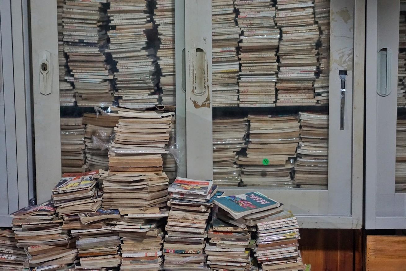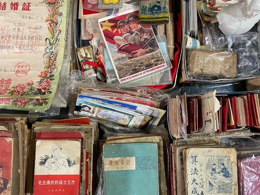 Tall vases painted in the traditional blue and white pottery style sit covered in dust next to empty frames, woven bags and obsolete electronics that may have never functioned properly in the first place. The easiest game to play is ‘spot the Mao,’ with smiling busts, Little Red Books and both color and black-and-white pictures of the Great Helmsman scattered throughout.