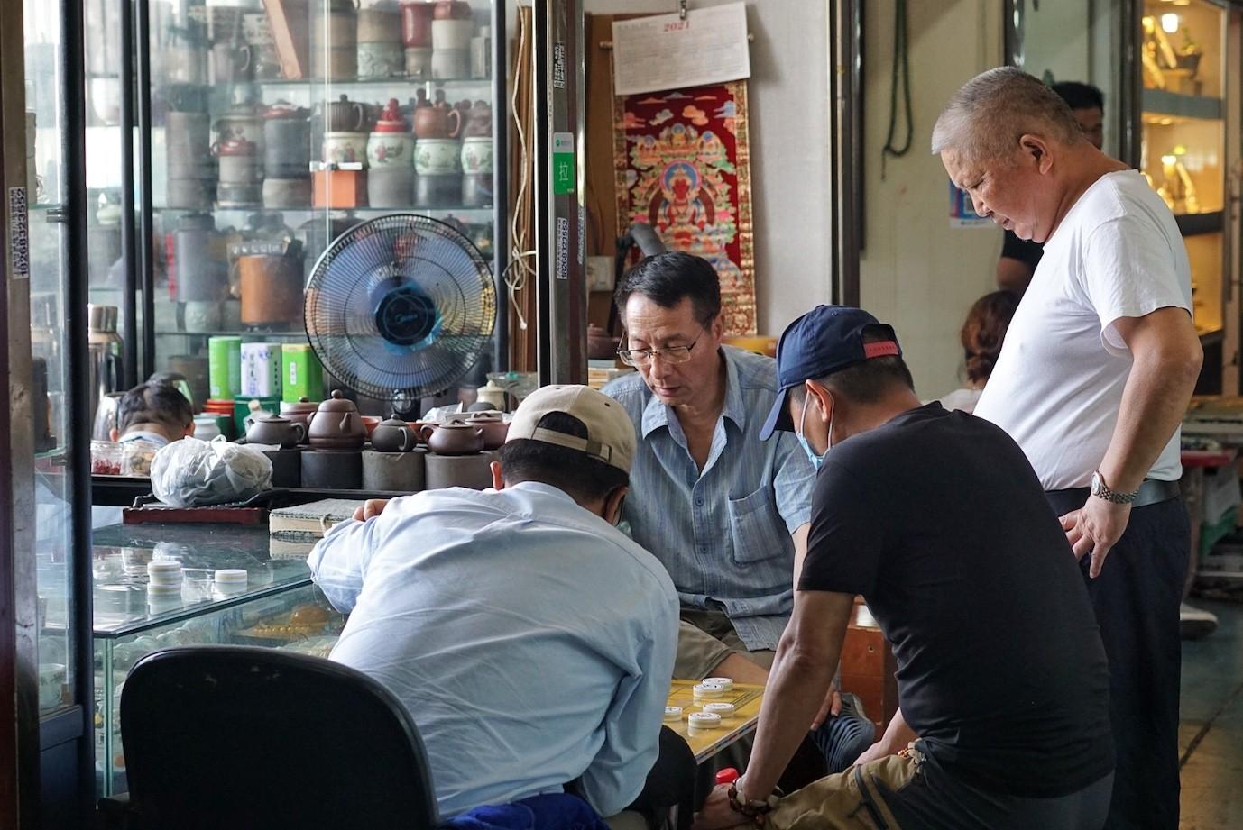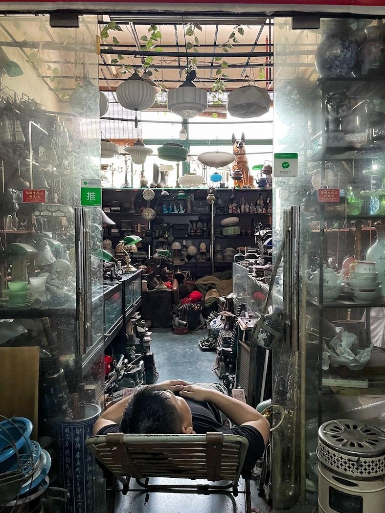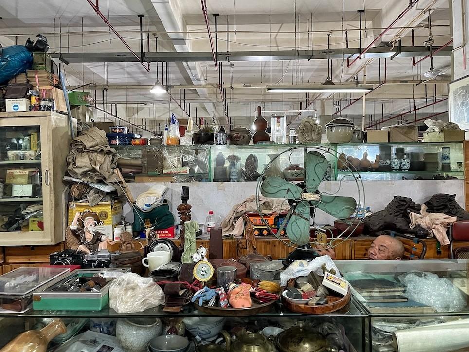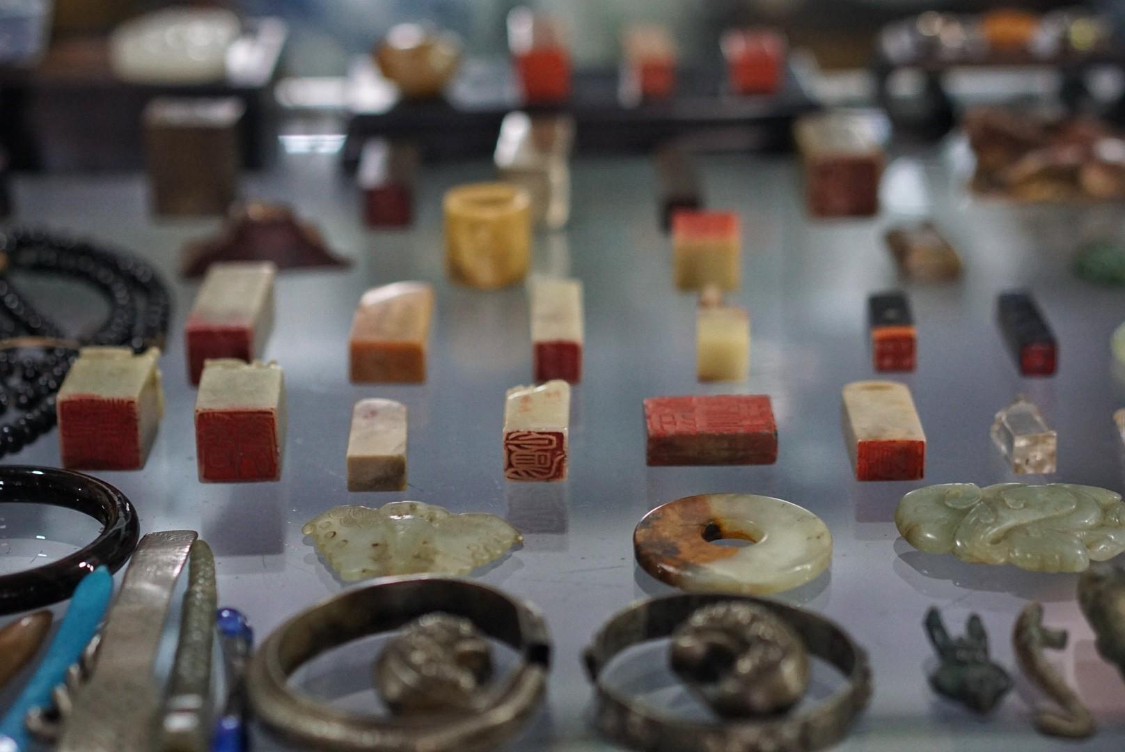 Creaking record players are heaped next to piles of cassettes, worn stamps, rolled posters and a myriad of clocks in all shapes and sizes, most of which stopped ticking years ago. Jade ornaments, rusting coins, broken watches and uniquely-shaped canisters are interspersed between wooden carvings, pounded aluminum cigarette cases, tarnished hair pins and ceramic pots, chipped from age and wear.