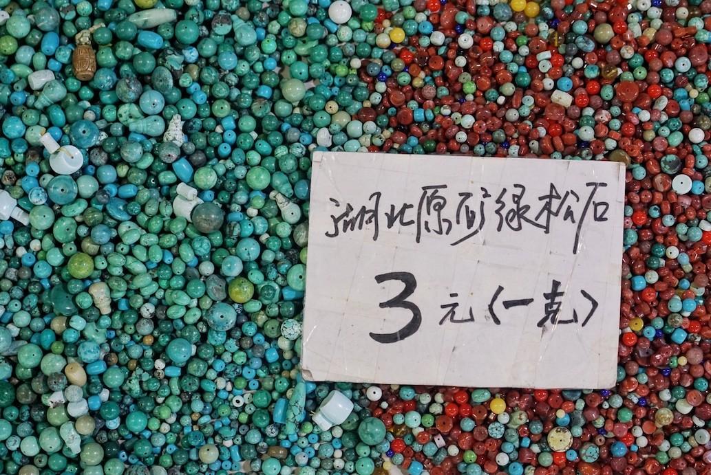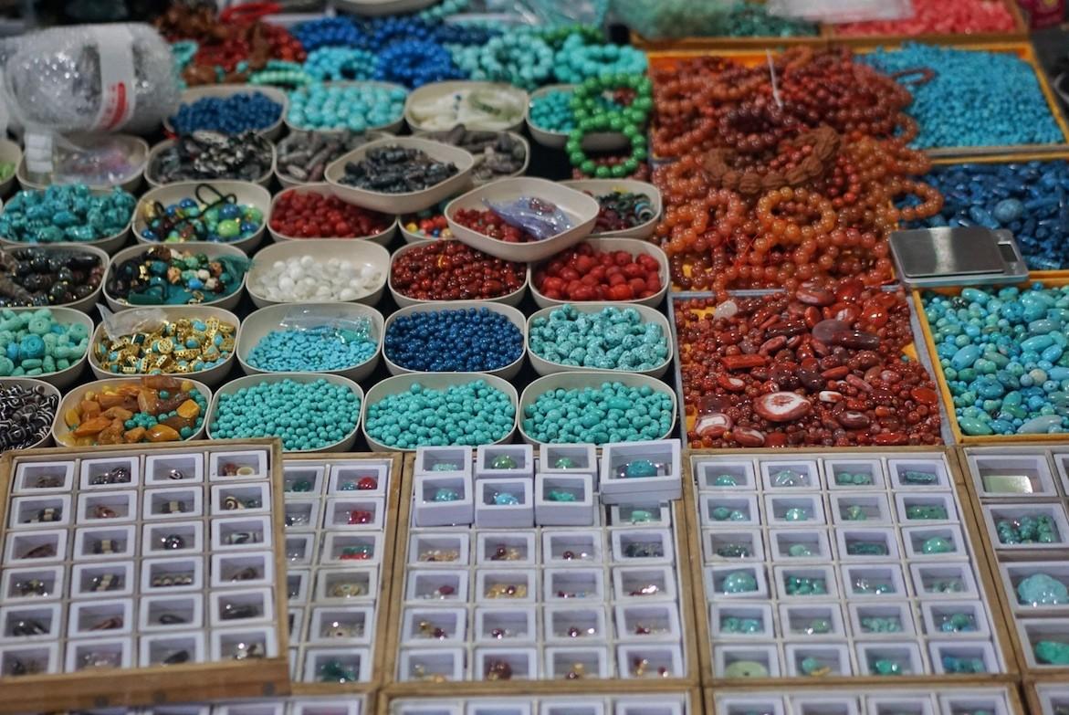 On the second floor of the market, the piles are replaced by fabric cloths, laid out on the cement ground and covered in colorful beads, jade, jewelry and smaller items of interest. Bargaining levels jump an octave, as does the humidity and dank heat, intermingled with the mumbling of eager purchases and the crack of electric mosquito nets.