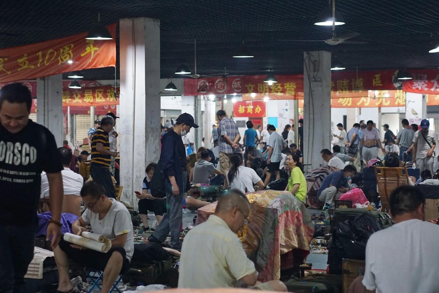 The floor is littered with remnants of hours passed waiting for a big sale – empty cigarette packs, torn bubble wrap, plastic bottles, browning apple peels, dirty napkins and half-eaten baozi, begging the question: where did this all come from, and who is purchasing it?