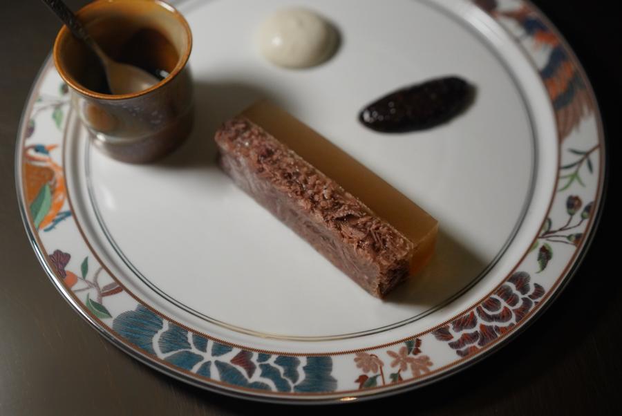 An oxtail "lasagna" of sorts, the Oxtail Kholodets (RMB128) sees beef slowly simmered over wood so that the collagen releases and forms a gelatin layer. The two layers are combined as one, plated alongside a trip of green herb pesto, horseradish cream, and black garlic mustard.