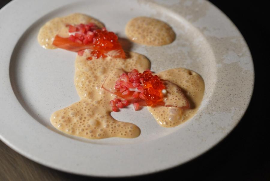 Ryazhenka – a sour, baked milk product of Russian, Ukraine, and Belarus made with lactic aid fermentation – is the star of the Salted Salmon (RMB188), a 16th century dish boasting an overtly funky, umami-forward flavor. Dill-salted salmon is cured with gin, doused in said ryazhenka and finished with fresh raspberries, horseradish gel, and salmon roe.