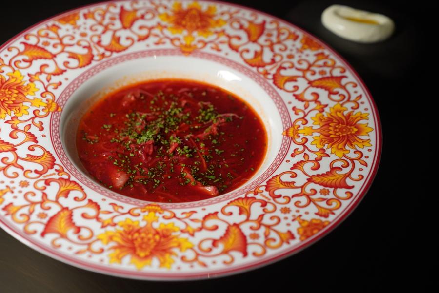 Onto the soup, the Borscht (RMB145) is not to be missed, a signature of the restaurant, and for good reason. At once rich and indulgent yet light, the borscht base is enhanced by slow-cooked duck, the poultry's fat melting into the stock alongside potato, beetroot, carrot, onion, and cabbage for the utmost concentrated flavor. The duck leg meat is cold-smoked and added back as a luscious addition that results in pure comfort your inner babushka longs for. Homemade whipped sour cream and brown butter are served on the side, so diners can choose their preferred level of creaminess.