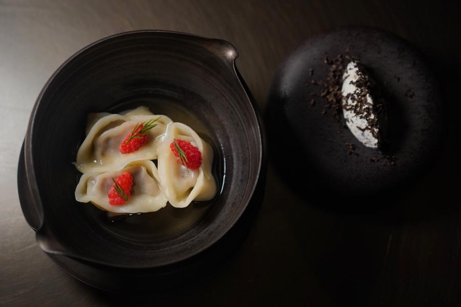 Equally satisfying, the Siberian Beef Dumplings (RMB185) feature koji- and buckwheat-aged beef shortrib slow-cooked for 24 hours before being cubed and marinated in beef jus with caramelized onions. That beef and onion umami explosion is then folded into perfectly pleated dumplings swimming in a full-bodied consommé, a tart pop of fresh raspberries cutting through its richness.