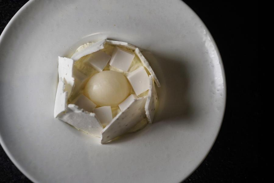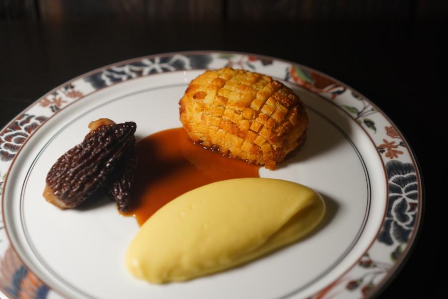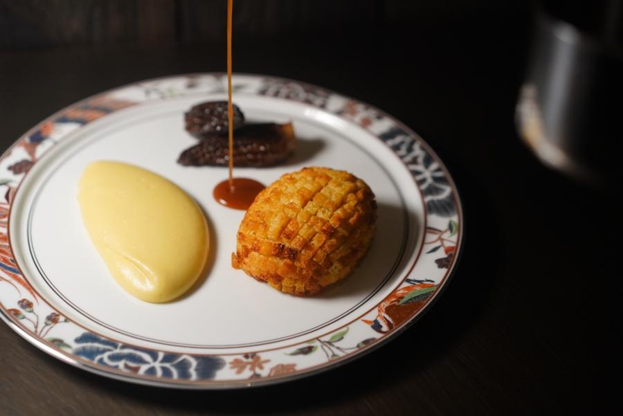 The posterchild for meticulous precision, the Pozharsky Cutlet (RMB305) is Vikentev's take on the famous 19th-century Russian dish consisting of breaded, pan-fried chicken patties, renowned for their extreme juiciness and tender texture. The preparation involves cutting white bread into exact squares, drying them, and then painstakingly placing them (using tweezers) in a checkerboard pattern on all surfaces of said chicken. The cutlet is then fried in clarified butter for a golden brown, crunchy exterior with succulent meat below. Flanked by whipped mashed potatoes and chicken mousse and hazelnut stuffed morels, the plate is finally dribbled in chicken jus.