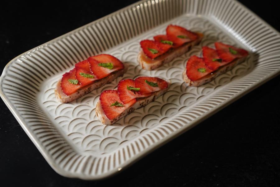 Another cold starter, the Dry-aged Yellowtail is torched before being stacked atop a shmear of homemade scallop and fishbone garum (a fermented fish sauce, cleverly dubbed the "ketchup of antiquity" as it was commonly used by the Romans in ancient Greece). Fresh strawberries, briny capers, and lemon balm leaves temper the garum's pungency while enhancing yellowtail's inherent sweetness.