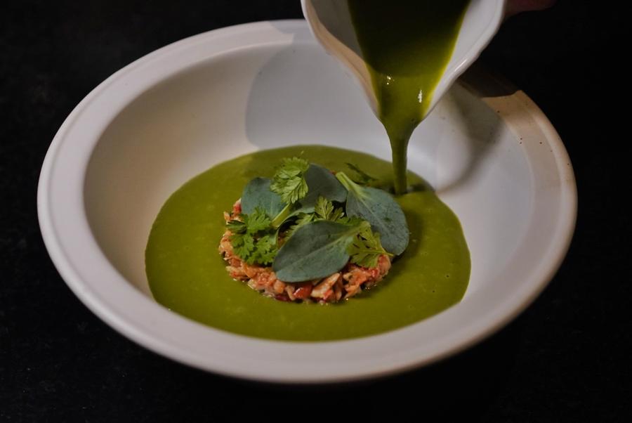 Uniquely silken yet simultaneously clean and fresh, the Green Cold Soup is an earthy emulsion of all that is nourishing, presented in a moat that encircles Russian Kamchatka crab meat and homemade sour cream. Fried arugula, avocado, and cucumber form the verdant base, while shellfish oil, crab garum, chervil, and oyster leaves lend layers to this rustic indulgence that keeps you lapping until the last drop.