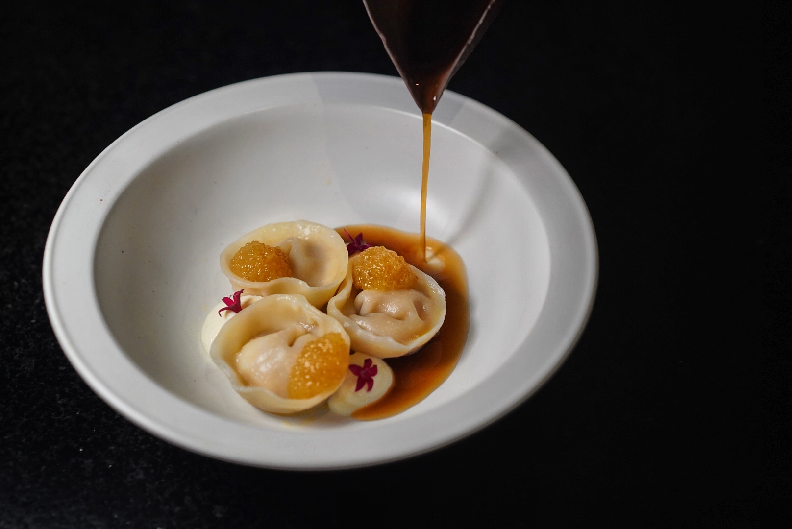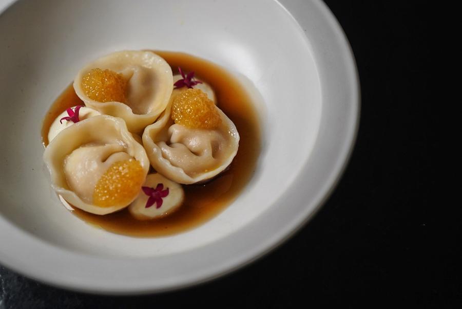 Antarctic Tooth Fish Dumplings – Foie gras, Russian pike roe, mushroom, citrus sour cream, hay stock