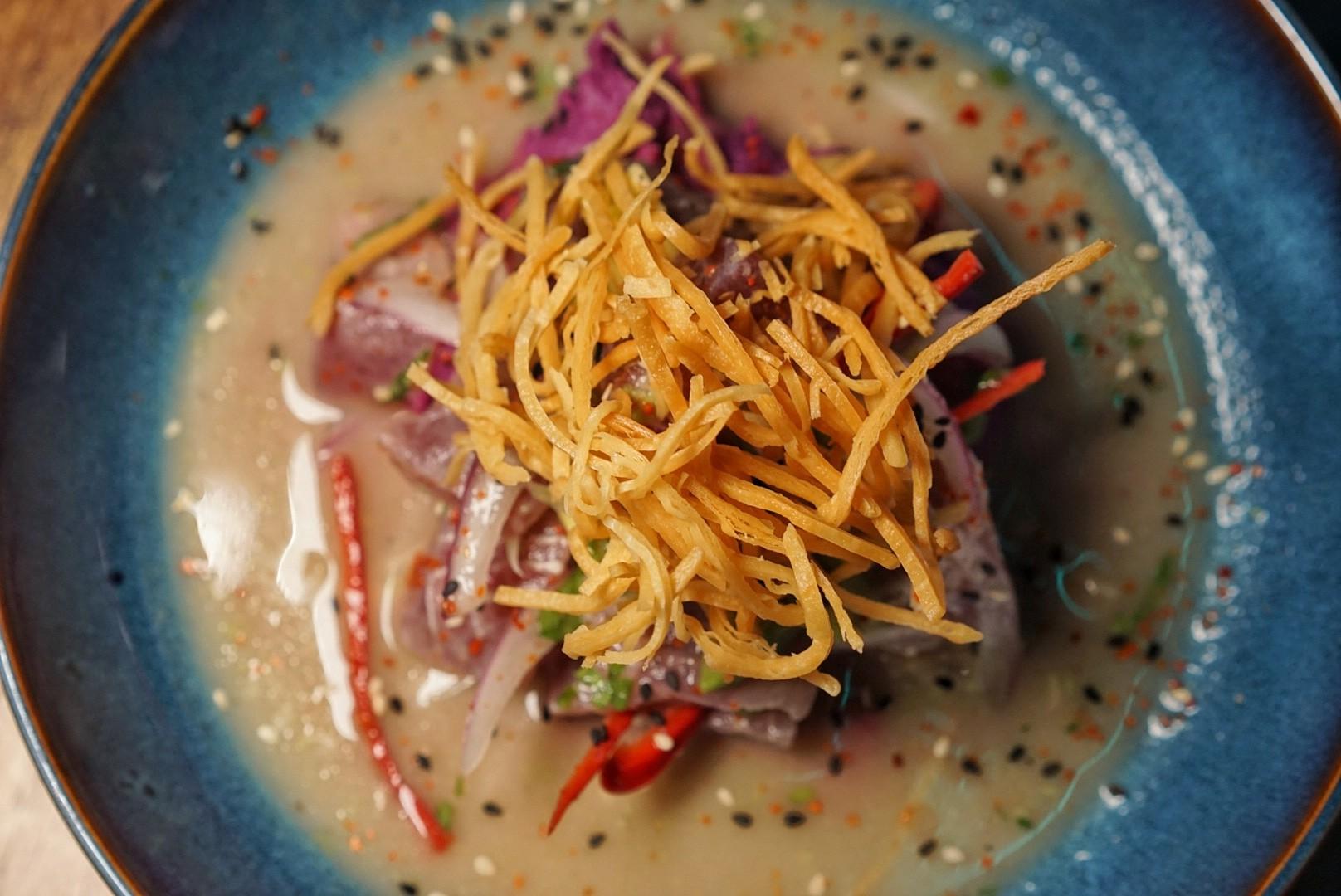 Starting with something fresh, the Nikkei Ceviche (RMB68) is a heaping portion of roughly chopped raw tuna, soaked in leche de tigre – a Peruvian marinade of fresh citrus juices, chili oil and seasonings spanning turmeric and cinnamon to chili and coriander – drizzled with sesame oil and topped with chili flakes. Fried wonton crisps adorn the top, while a bed of purple potato purée grounds the myriad of flavors.