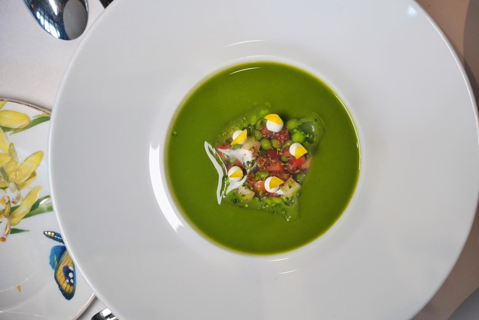 Starters include Broccoli Soup, poured as a moat surrounding a water chestnut, fresh strawberry and green pea salad. Sheathed by a vegetable stock jelly, lemon-laced Normandy cheese dots further augment the soup’s velvety mouthfeel.