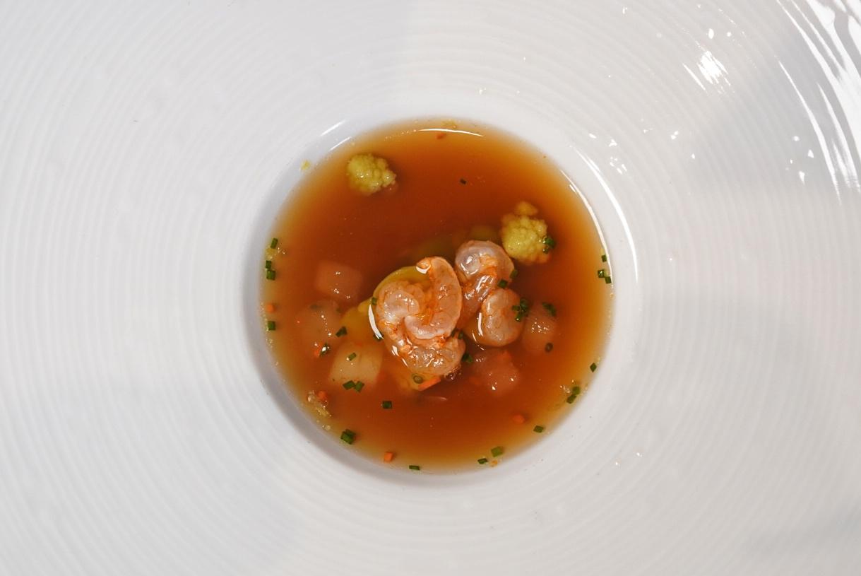 Prawns in a second form are swimming in a lime leaf prawn emulsion alongside cauliflower, fava beans and aloe vera, the optimal balance of sweet umami.